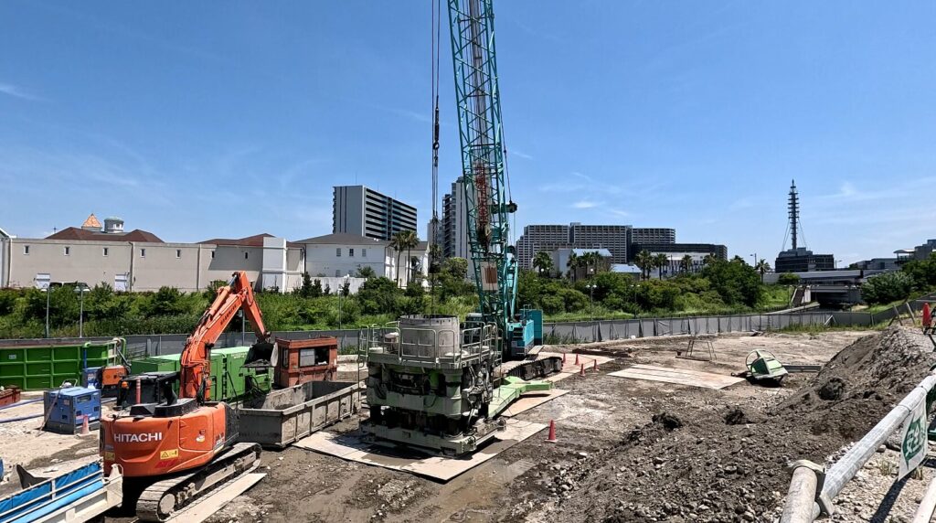 関西万博に近いこの現場では、ホテル建設が予定されており、研修当日は地中に埋まっていた昔の防波堤を取り除く作業を見学しました。巨大な機械を用いてコンクリートを掘削・除去する工程は、本社がある但馬地域ではなかなか見られないものであり、若手社員にとって大変貴重な経験となりました。