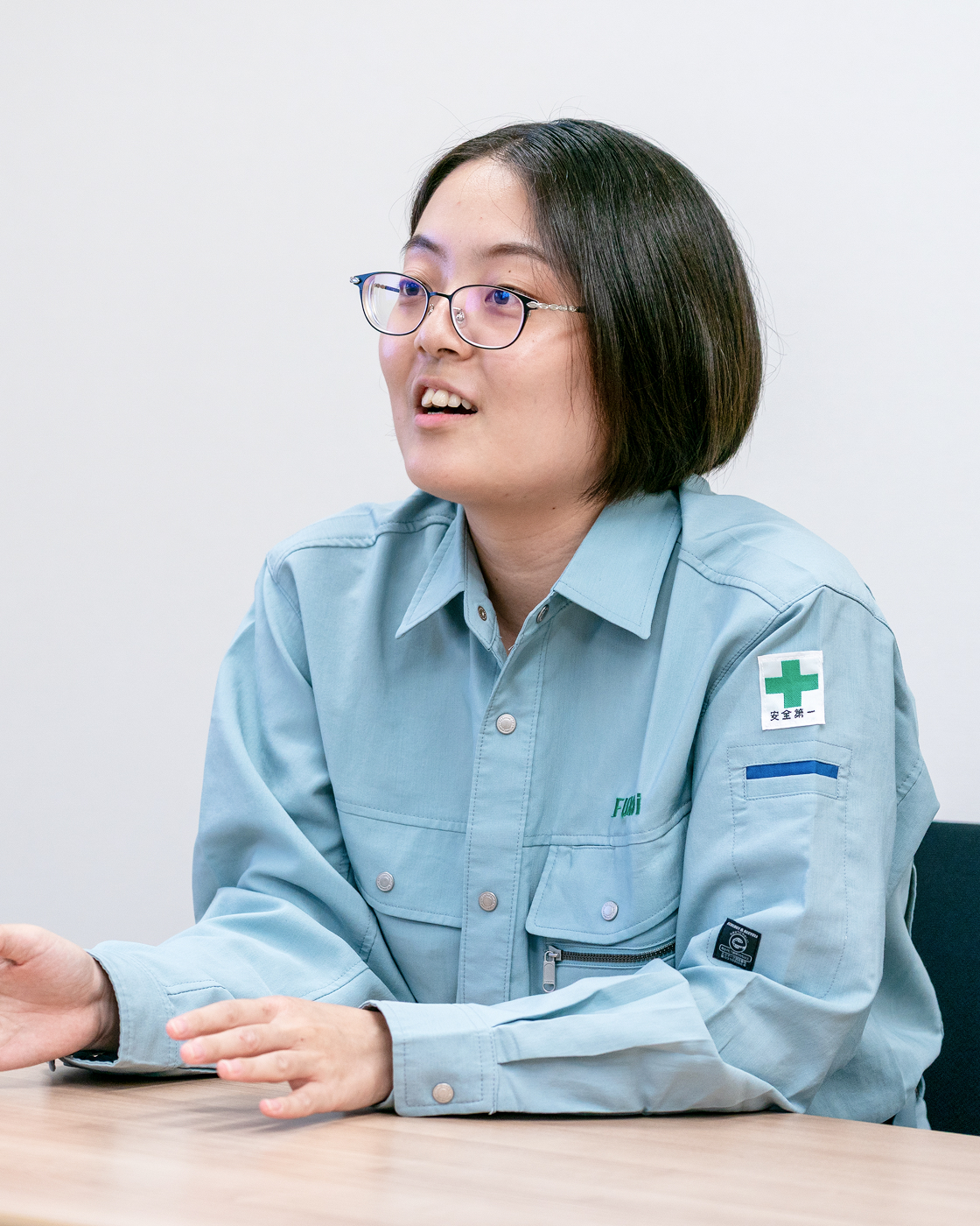 - 地元は京都なのですが、祖父が豊岡に住んでいて土木工事で交通が便利になればいいなと思っていたのと、施工管理という仕事に興味を持っていたのが入社のきっかけとなり、当社で働くことを決めました。