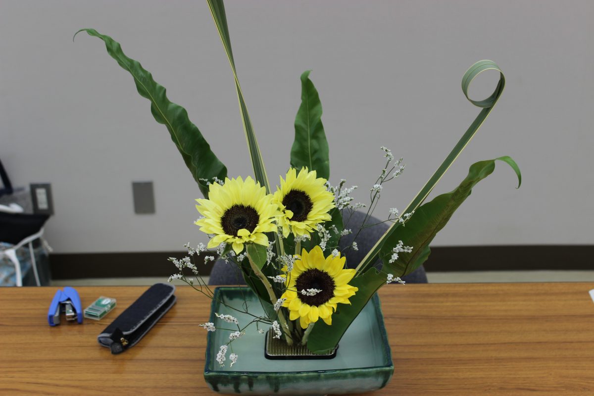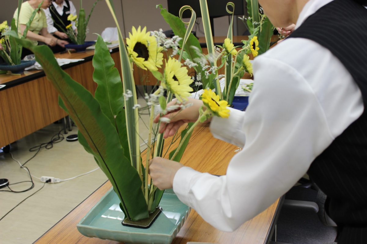 ひまわり、キノブラウン、ニューサイラン、タニワタリを使った季節の生け花に取り組みました。